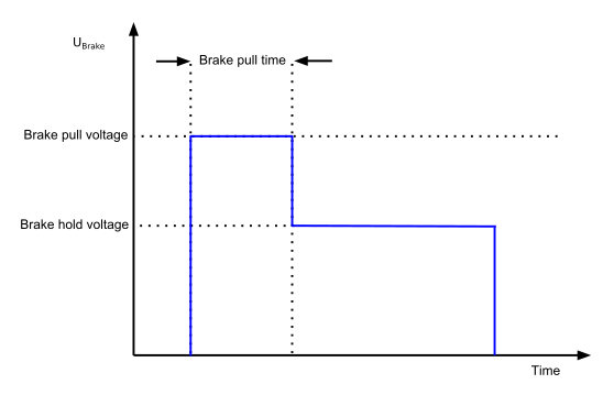 When the motion service allows motion, the specified “Pull voltage” will be generated for a configurable amount of time designated as “Pull time”. After this time period, the second voltage level (Hold voltage) will be applied to the brake terminals permanently. The brake hold voltage can be set to a lower value to save energy.