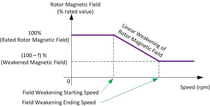 Once the motor speed hits “Field Weakening Starting Speed”, the field weakening procedure starts to linearly reduce the magnetic field of rotor until the motor speed hits “Field Weakening Ending Speed”. The user can also determine how many percentage of rotor magnetic field should be finally reduced. As a result, the slope of rotor field reduction would be: