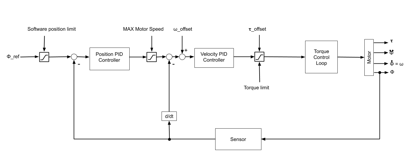 On top of the desired position input, both position control implementations also accept a desired ‘offset torque’, which is a dynamically changeable torque value that will be added to the torque value generated by the velocity PI controller. For further reference see Torque Offset