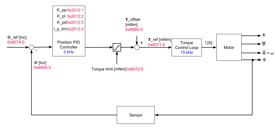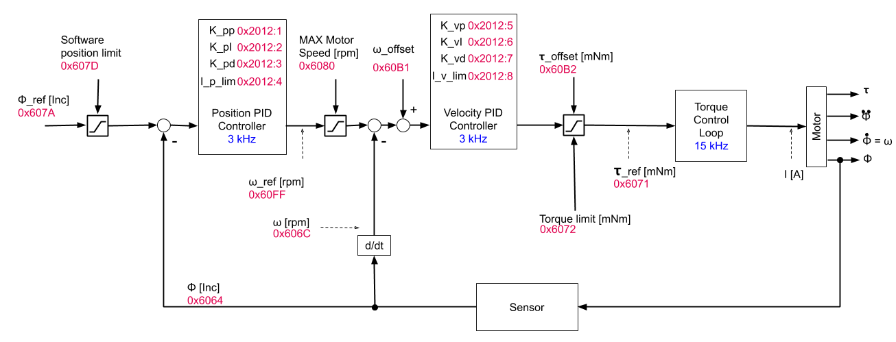 The cascaded position controller consists of two PID feedback loops. The outer loop is used to compare the target position (current position setpoint) with the actual position value. From this difference, the PID controller computes a target velocity. The inner loop will compare this target velocity with the currently measured velocity and feed this difference to another PID controller that generates a target torque from this. This target torque is then controlled by the torque / current control loop described in the section on Torque Control. The overall control structure including the underlying torque control loop, the relevant update frequencies and the object numbers is shown in a simplified form in the figure above.