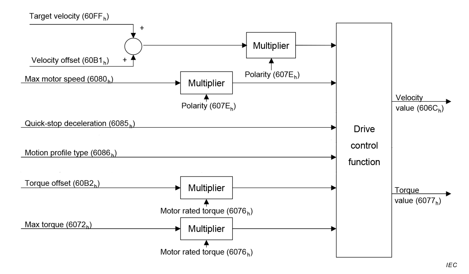 The figure above shows the inputs and outputs of the drive control function. The input (from the control device point of view) are the target velocity and optionally, a velocity offset (to be added to the target velocity) as well as a torque offset. The drive control function in the diagram contains both the velocity controller and the torque controller, where the output of the velocity control loop is used as an input for the torque control loop.