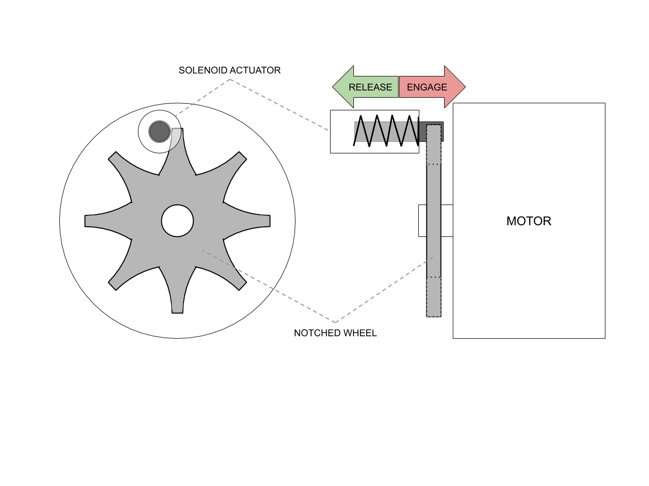 To release a pin-type brake, the motor must move slightly so that the pin can slide out. This is mainly required with hanging loads (e.g. robot arm) where gravity is producing a torque pressing the wheel notch against the actuator pin. The following method is implemented to ensure reliable pin-type brake operation.