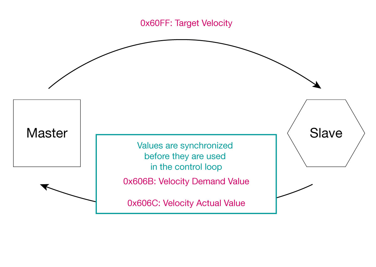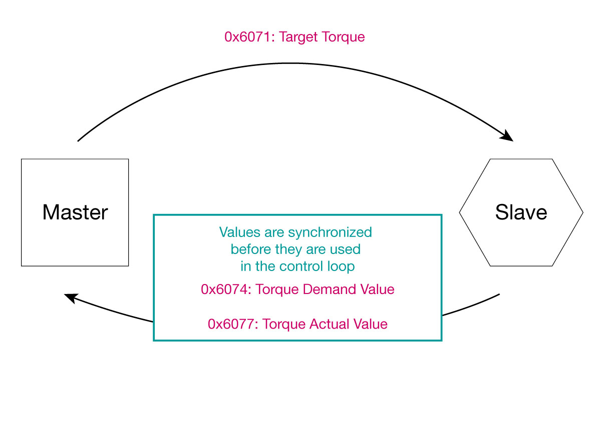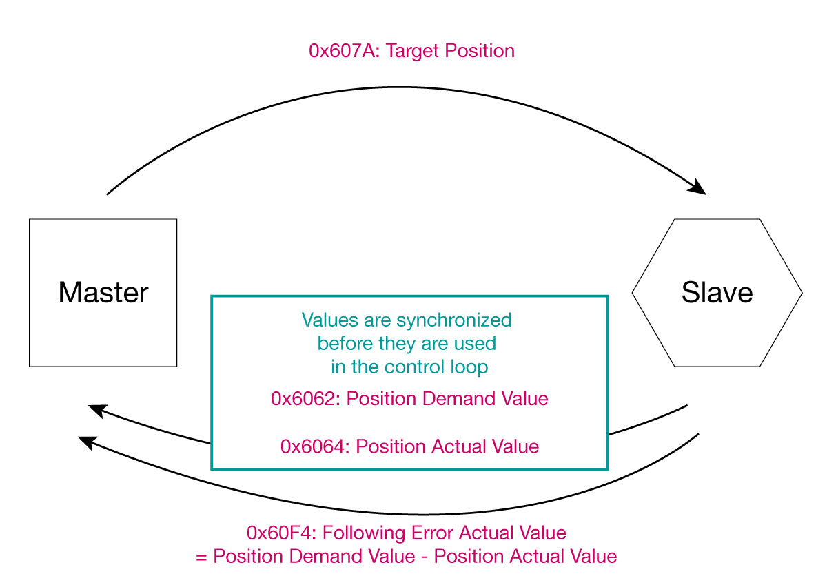 Two communication cycles after the master sends a target value to the slave (position/velocity/torque), the slave sends back two values: the Demand Value, indicating the value that was received by the slave and the Actual value as read from the sensors. These values are synchronized and sampled from inside the control loop.