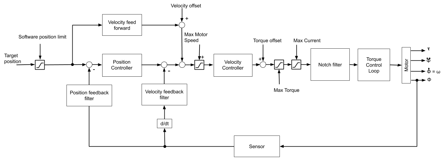 On top of the desired position input, both position control implementations also accept a desired ‘offset torque’, which is a dynamically changeable torque value that will be added to the torque value generated by the velocity PI controller. For further reference see Torque Offset