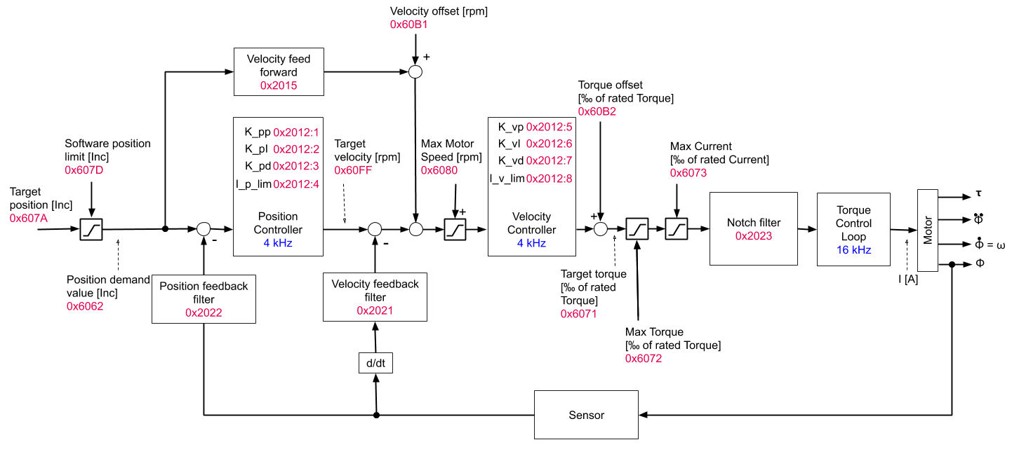The cascaded position controller consists of two PID feedback loops. The outer loop is used to compare the target position (current position setpoint) with the actual position value. From this difference, the PID controller computes a target velocity. The inner loop will compare this target velocity with the currently measured velocity and feed this difference to another PID controller that generates a target torque from this. This target torque is then controlled by the torque / current control loop described in the section on Torque Control. The overall control structure including the underlying torque control loop, the relevant update frequencies and the object numbers is shown in a simplified form in the figure above.