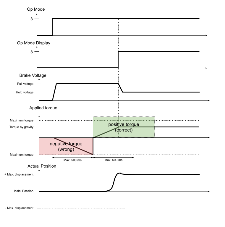 The brake controller raises the torque progressively until it reaches the maximum displacement threshold. If it reaches the maximum torque threshold first, it rises the torque again in the opposite direction. When the torque is high enough to compensate for gravity, the load is lifted until the position reaches the threshold value, the torque stays to a holding torque value and the brake will be disengaged. After the release delay, the brake voltage is driven to “Brake hold voltage” and Op Mode display is set to Op Mode. The controller is then enabled. To use the pin-brake mode please select the correct “Release strategy” in the brake configuration section in OBLAC Drives commissioning software, or via direct object dictionary access.