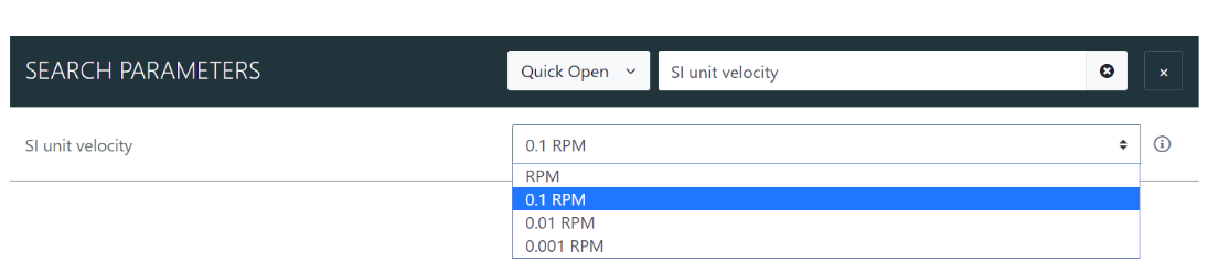 In OBLAC Drives choose 0.001 RPM for SI unit velocity.