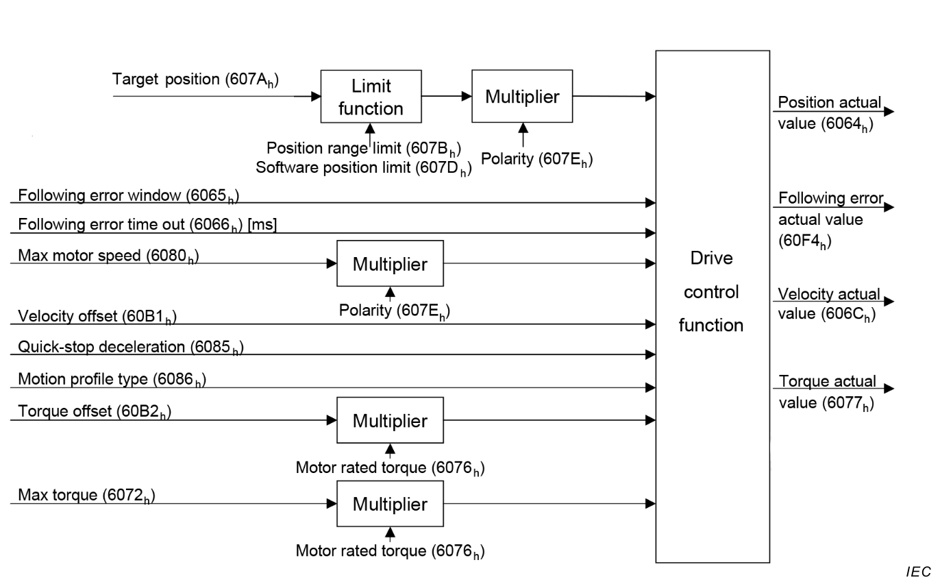 The figure above shows the inputs and outputs of the drive control function. The input values (from the control function point of view) are the target position as well as an optional velocity offset and an optional torque offset used for feed forward control. Especially in a cascaded control structure, where a position control is followed by a velocity or torque control, the output of the position control loop is used as an input for further calculation in the drive device. Limit functions can be used to restrict the range of values to avoid unintended positions. The drive device monitors the following error.