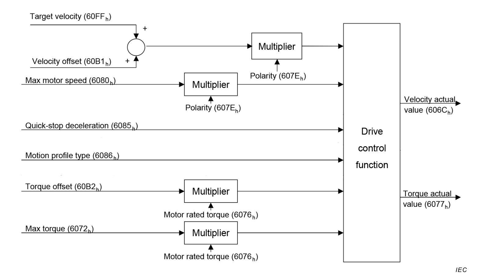 The figure above shows the inputs and outputs of the drive control function. The input (from the control device point of view) are the target velocity and optionally, a velocity offset (to be added to the target velocity) as well as a torque offset. The drive control function in the diagram contains both the velocity controller and the torque controller, where the output of the velocity control loop is used as an input for the torque control loop.